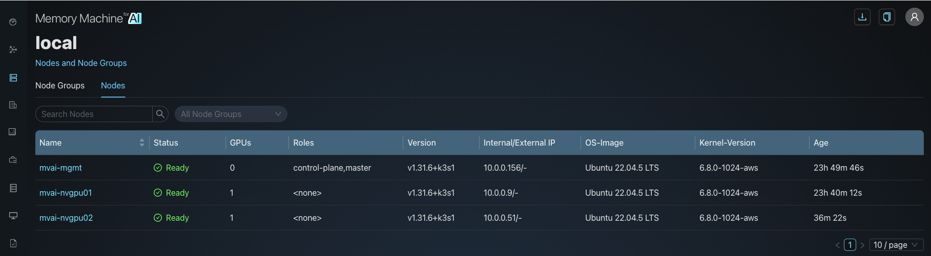Login to the MemVerge.ai Management UI Console and verify you can see the new node in the nodes list https://mmai-mgmt/dashboard/nodes
