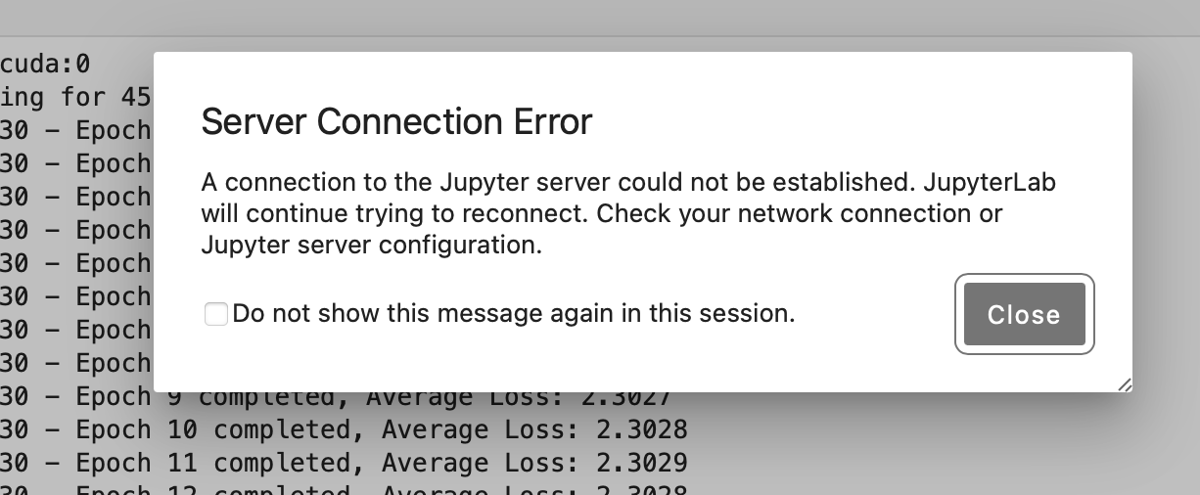 The gap in epoch numbers is due to the reconnect lack of the notebook, is it? The stdout is lost.