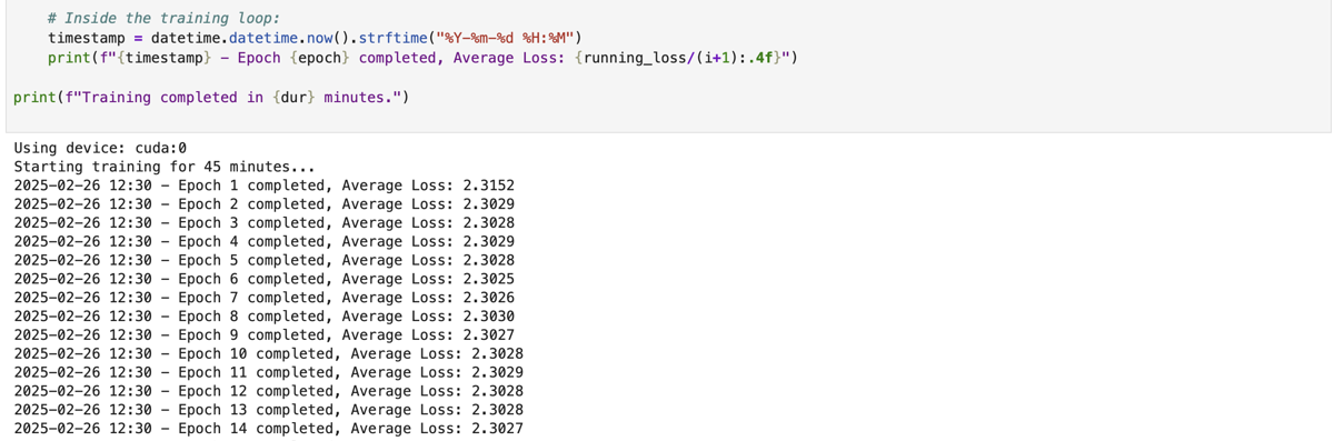 print(f"{timestamp} - Epoch {epoch} completed, Average Loss: {running_loss/(i+1):.4f}")