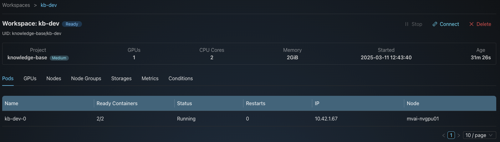 - Shows the node(s) where this Workspace’s pods are running, including Node Name and Roles (e.g.,