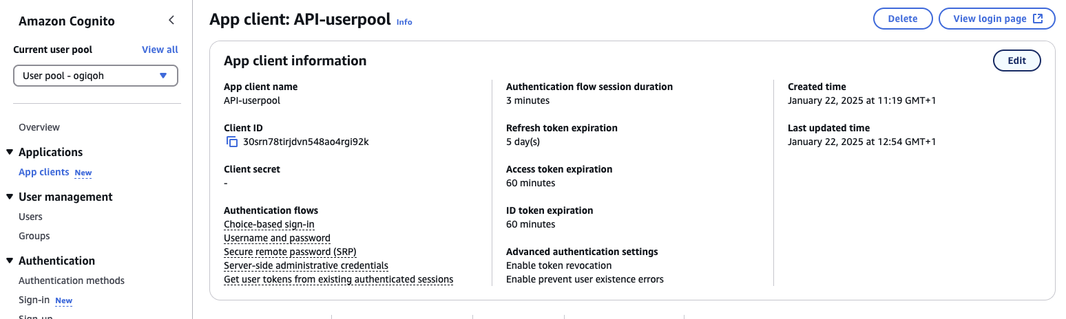 Go to the Identity Pool overview, note down the User pool ID, and click on App client in the menue.
